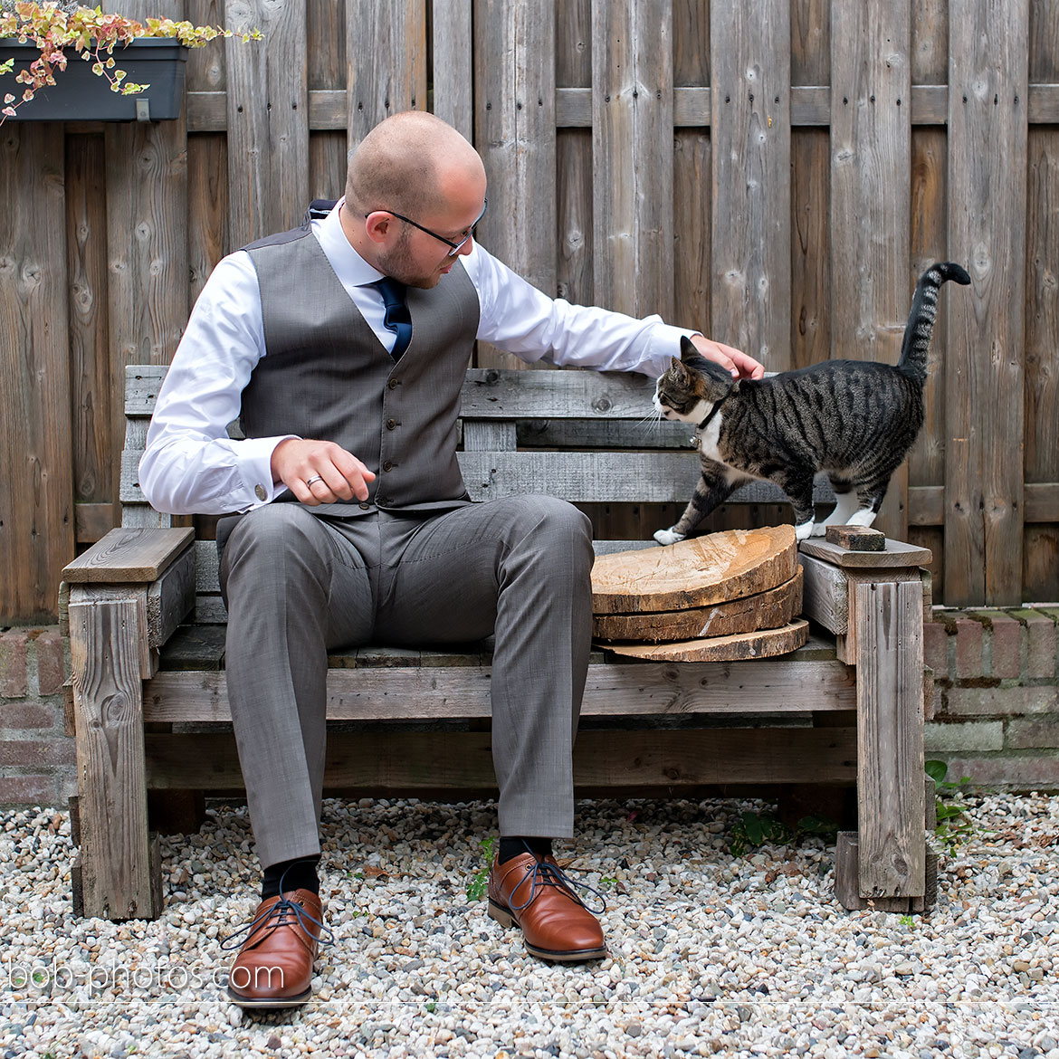 Toen we aankwamen bij het huis van Sanne haar ouders in Wouw hoorde we al een vrolijke bruid zingen onder de douche. We begonnen met een lekker kopje koffie en daarna het fotograferen van de voorbereidingen. Sanne had alle belangrijke spulletjes al bij elkaar neergelegd. En zo nodig wilde het zusje van Sanne graag helpen. Ook bij Dirk die in Bergen op Zoom was in hun eigen knusse huis, was het een super sfeer. Er werd een vinylplaat gedraaid met Dirk zijn favoriete muziek. Samen met zijn beste vriend deed hij zijn voorbereidingen en toen alles klaar was nog even tijd om te gamen op de playstation. Het trouwvervoer was een nostalgische Citroën deux chevaux . Bij het tanken ging het even mis (hij wilde niet meer starten) maar daar waren uit het niets de hulptroepen die de auto wel even wilde aanduwen, en zo kon Dirk zijn weg weer vervolgen.