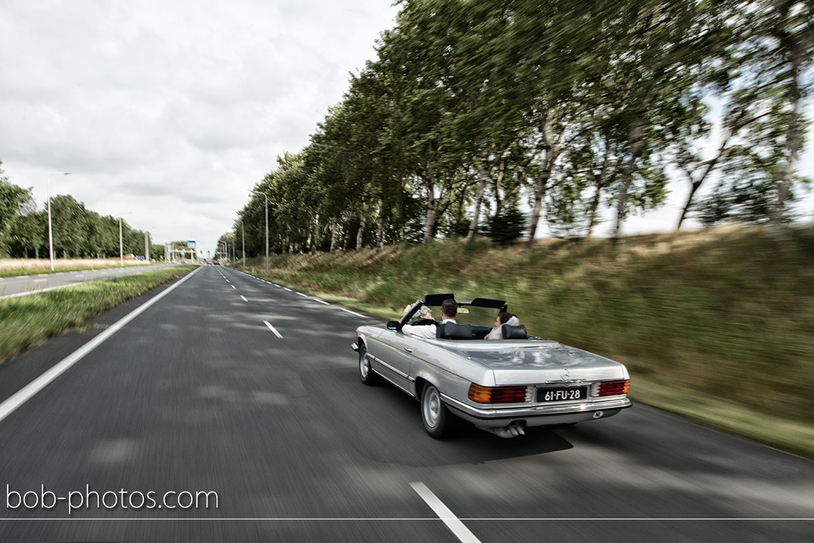 Na de emotionele mooie first-look zijn we naar verschillende fotolocaties gereden. Het bruidspaar voorop in de old timer Mercedes SL280 cabrio uit 1975 van Hylke zijn vader.