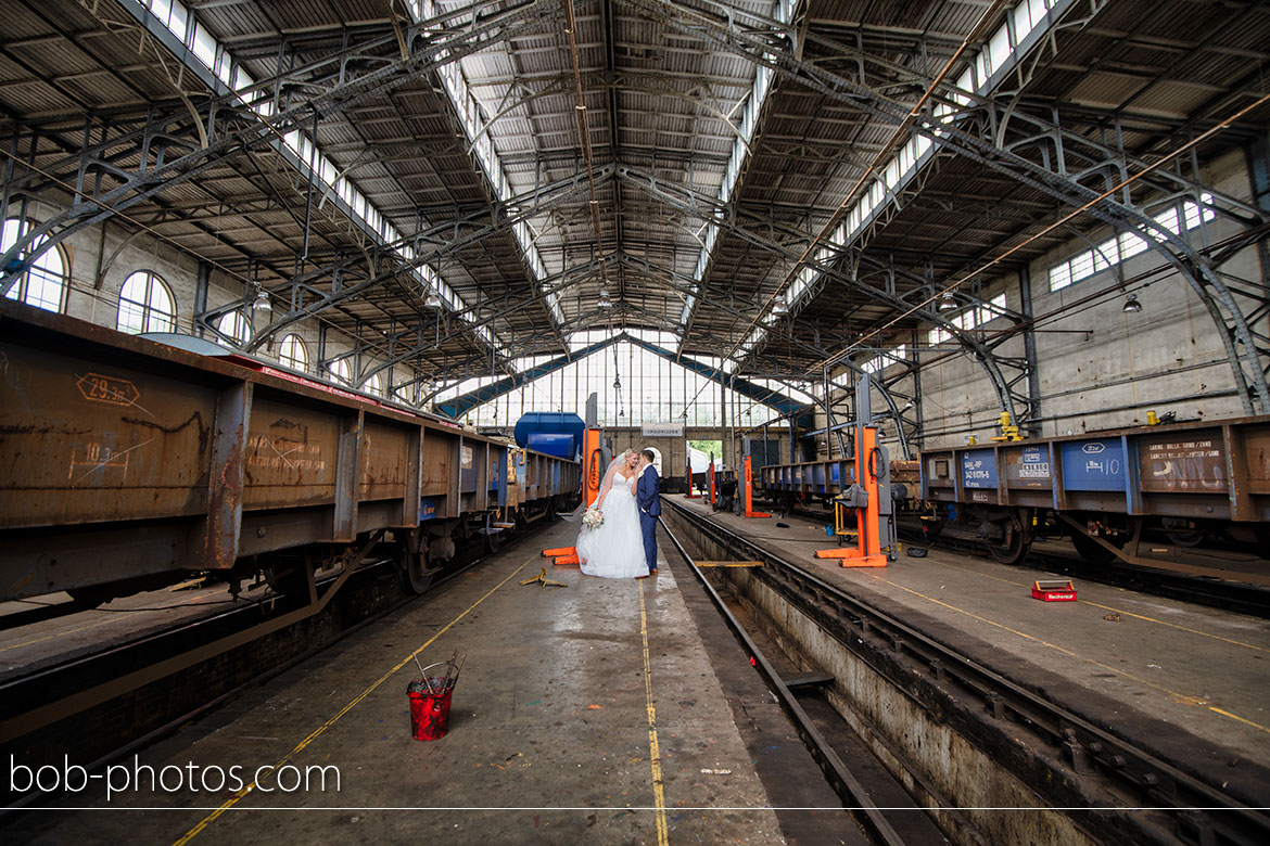 In de (versierde) achtertuin was de first look. Altijd een super spannend en mooi moment. Na elkaar helemaal bewonderd te hebben was het tijd om te vertrekken voor de fotoshoot. De trouwauto een Mercedes Benz Coupé was net groot genoeg om al de tulle van de jurk in te passen. De locatie was een stoere trein remise met veel details, kleur en en toffe plekjes, zowel binnen als buiten.
